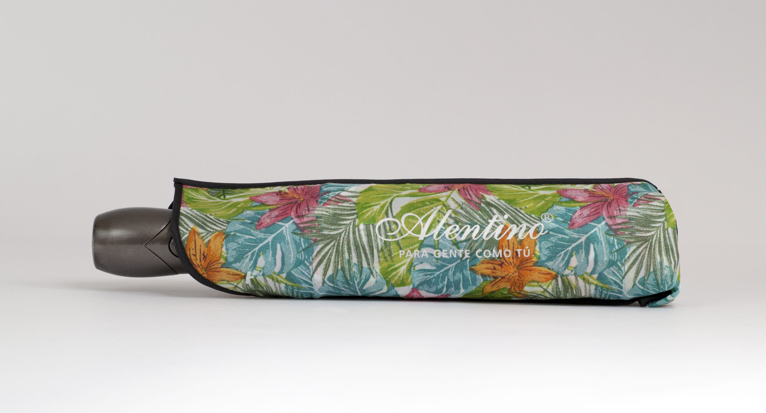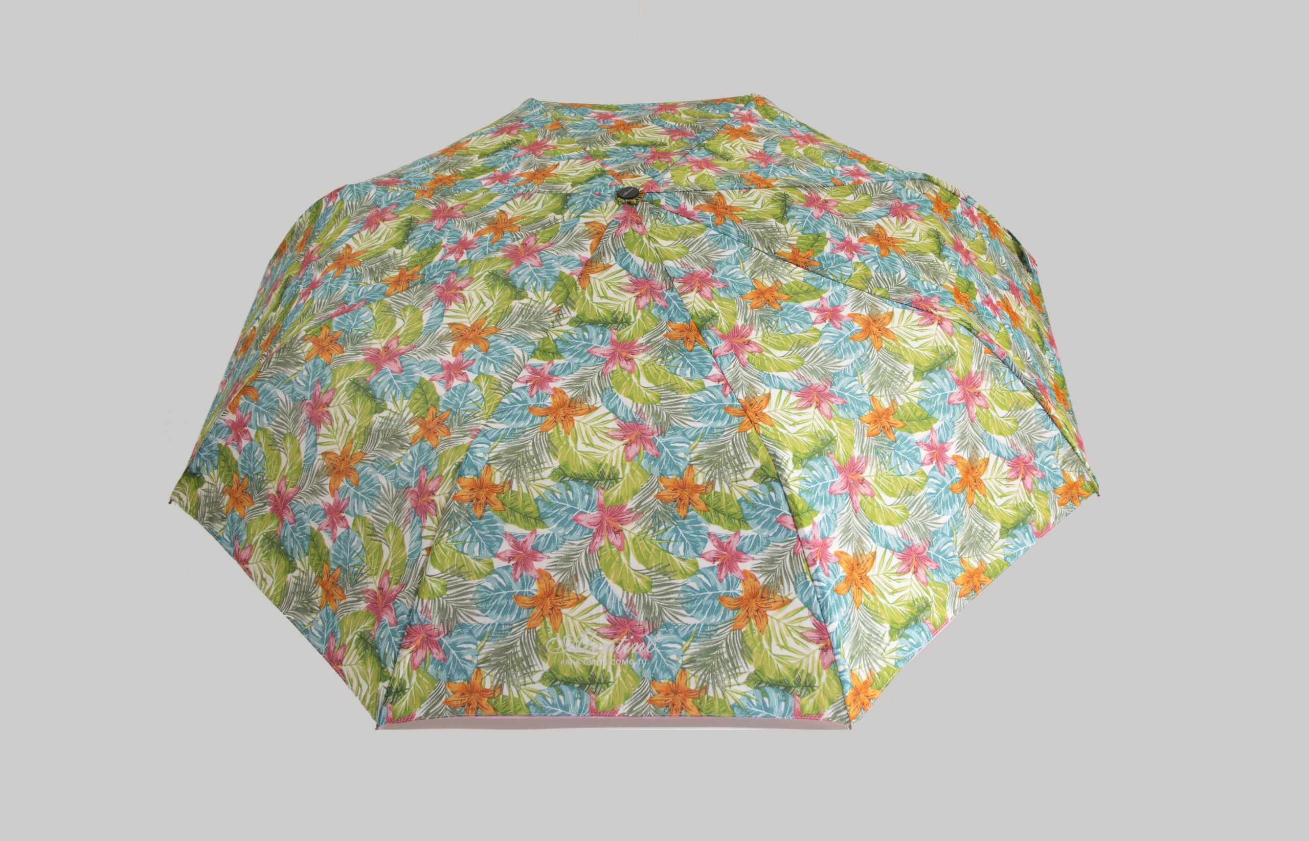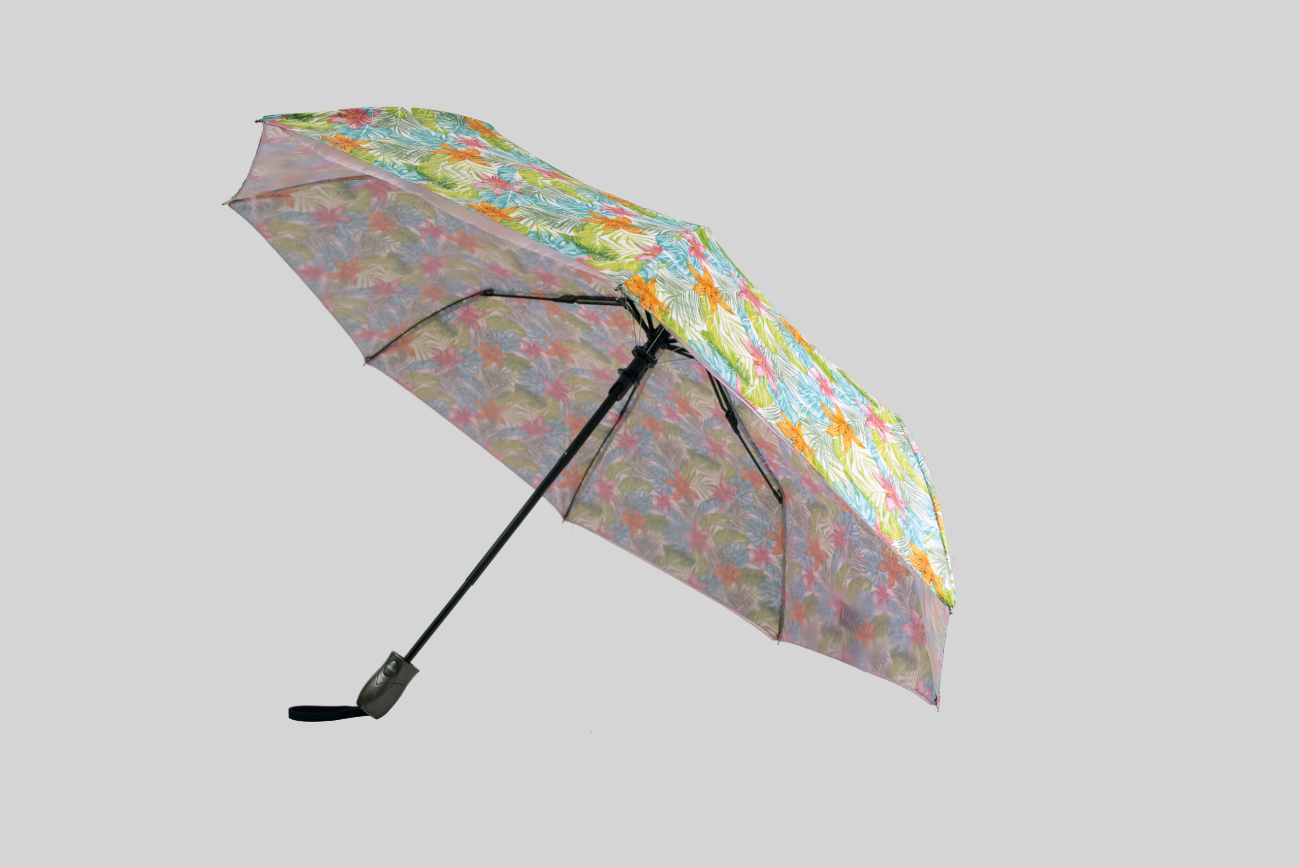 Sombrilla semiautomática, doble tela con estampado flores tropical.